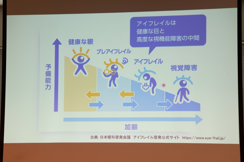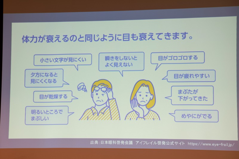 また、アイフレイルの原因となる病気として、老視(老眼)、白内障、緑内障、糖尿病網膜症、加齢黄斑変性症を挙げた。つぎに、根岸氏は老視にフォーカスを当て、ピントが合う距離(近点)が年齢とともに遠くなることから近くが見えにくくなる、と説明。
