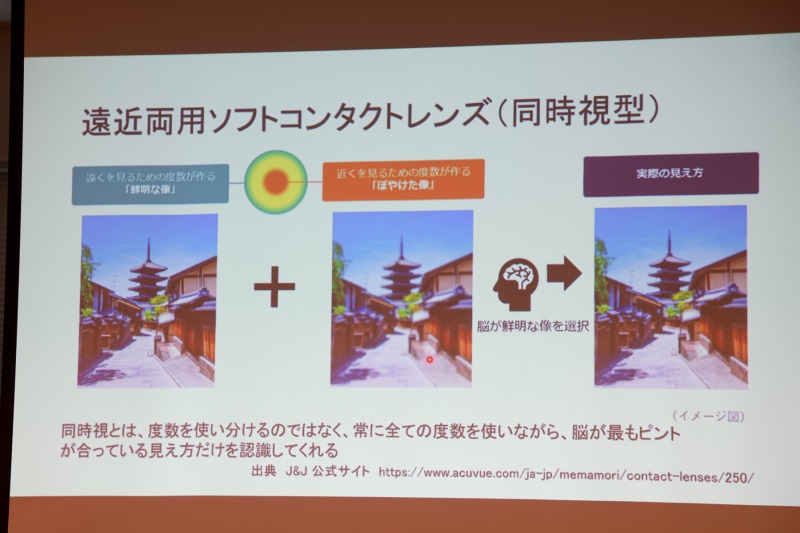老視の治療としては、メガネは老視用メガネなど、コンタクトレンズは遠近両用コンタクトレンズとモノビジョンの2種類があると紹介した。コンタクトレンズ装用者の老視対策としては、メガネ併用(コンタクトレンズ+老眼鏡)、モノビジョン(片目遠く用、片目近く用)、遠近両用コンタクトレンズ(遠くも近くも同時に見える)といった選択肢があることを伝えた。