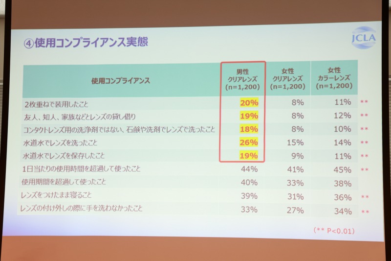 コンタクトレンズユーザー実態調査の結果について、佐藤氏は「全体として、昨年から大きな変化はなかった。購入時の眼科受診は『購入するたびに眼科を受診する』がわずかに上昇。購入場所も『眼科や眼科併設のコンタクトレンズ販売店』が上昇するが、「友人・家族からもらった・借りた」も8%でコンプライアンスが守れていない。眼の異常(重症)に関して男性クリアレンズ使用者が著しく高く、コンプライアンスと相関があった」と総括した。