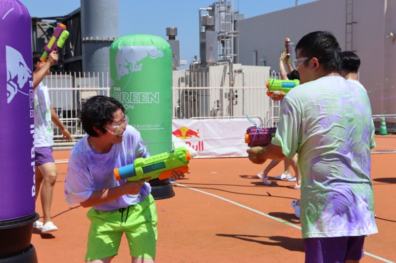 「Red Bull COLOR SPLASH -Green vs Purple-」は、水鉄砲でカラーインクを撃ち合い、どちらが相手を多く染められるかを競うイベントだ。参加者は白いTシャツを着用し、マスカット味をイメージしたグリーンカラーと、巨峰味をイメージしたパープルカラーをかけ合う。なお、使用されるカラーインクは口に含んでも安全な素材で開発された特注品であり、安心して楽しめる。