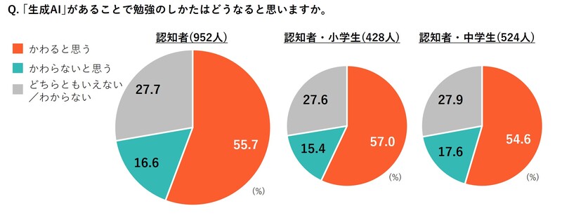 次に、「『生成AI』があることで勉強のしかたはどうなると思いますか。」と質問。「生成AI」認知者全体の中で「かわると思う」と答えた人は55.7%となり、半数以上が何らかの影響があると考えているようです。