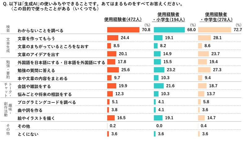 続いて、「生成AI」使用経験者に使用目的を質問。結果は以下の表のようになり、「わからないことを調べる」がトップとなり、検索エンジンのように調べものをする目的で使用している人が最多となりました。