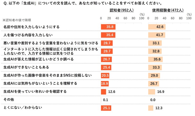 次に、「生成AI」認知者に「生成AI」を使うときに気を付けることを挙げて、知っている項目を聞いたところ、「名前や住所を入力しないようにする」が最も高い割合となりました。しかし、すべての項目において半数にも届いていないという結果に。利用上の注意点はあまり浸透しておらず、認識不足のまま利用している人が多いようです。