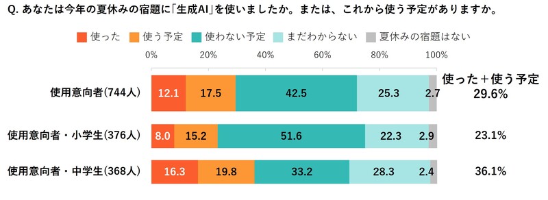 最後に、「生成AI」を「今後使うと思う」と回答した人に、夏休みの宿題に生成AIを使ったか(使う予定か)を質問。「使った」「使う予定」と回答したのは合わせて3割という結果になりました。また、小学生は半数以上が「使わない予定」と回答したのに対し、中学生は「使った」「使う予定」と回答した人が小学生と比較して高く、36.1%という結果となりました。