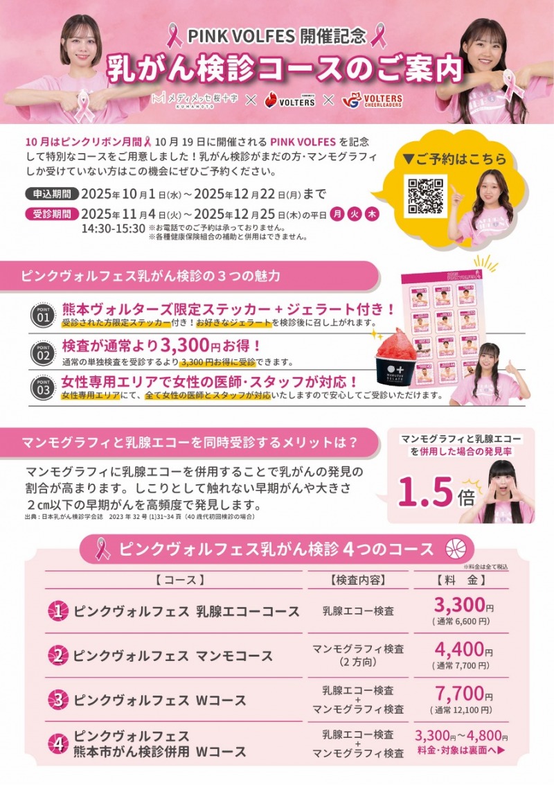 また、熊本市のメディメッセ桜十字にて、10月19日に開催されるPINK VOLFESを記念した乳がん検診コースの受付を開始。「熊本ヴォルターズ限定ステッカー+ジェラート付き」「検査が通常より3300円お得」「女性専用エリアで女性の医師・スタッフが対応」といった魅力があり、申込期間は12月22日まで。受診期間は11月4日~12月25日までとなっています。