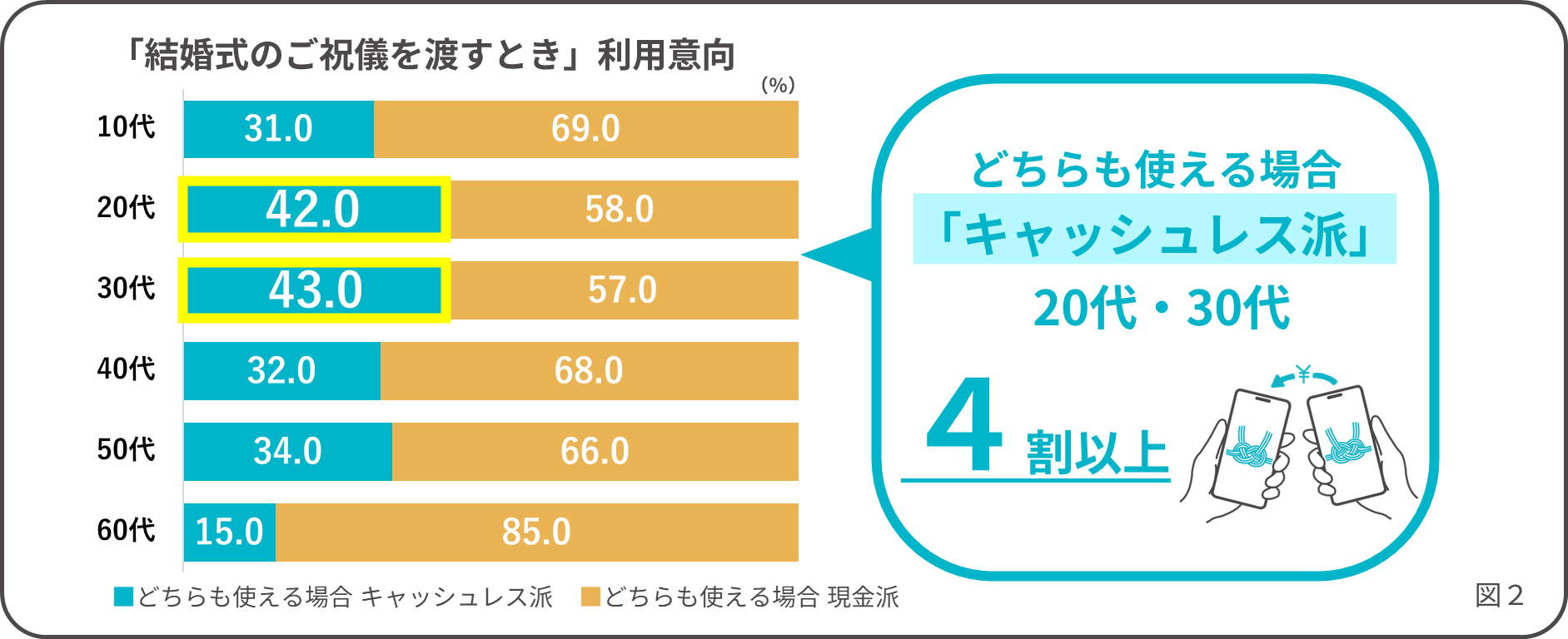一方、冠婚葬祭で現金派の理由は、「伝統的な慣習だから」が最多。特に「結婚式のご祝儀を渡すとき」における現金利用意向を世代別に見ると、60代が最も高く85.0%に。ほかの世代では20代58.0%、30代57.0%となり、世代間による意識の差が見られる結果となりました。