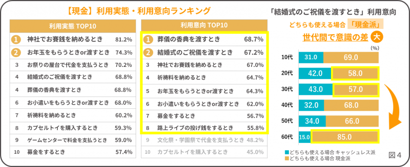 このように、冠婚葬祭シーンや、お小遣い・お年玉・募金・投げ銭などの「お金を贈るシーン」では、現金の利用意向が高い結果となりました。現金には経済的な価値だけでなく、文化的・情緒的、教育的価値が重視されているようです。