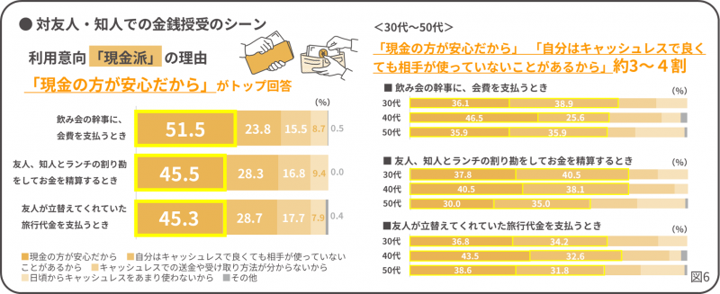 一方、現金派の理由としては、「現金の方が安心だから」がトップに。30~50代では「相手が使っていない場合がある」という回答もあり、相手の環境が整えばキャッシュレス利用意向はさらに高まる可能性があります。