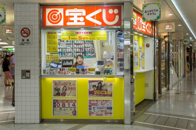 万博会場への直通バスが発着するJR大阪駅から阪急・阪神の梅田駅へ通ずる地下街でジャンボ宝くじを販売している売り場。「億の地下道」を合言葉にファンからの支持を獲得しています。