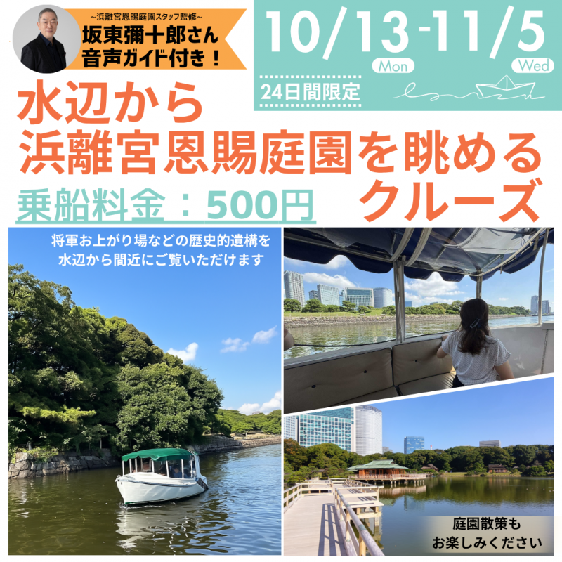 電動船に乗って、水辺から浜離宮の景色や歴史を感じられる特別なクルーズです!浜離宮の「将軍お上がり場」などの歴史的遺構を水辺から間近に眺めることができます。浜離宮恩賜庭園スタッフが監修した、歌舞伎俳優の坂東彌十郎さんによる特別音声ガイド付きのスペシャルクルーズです。