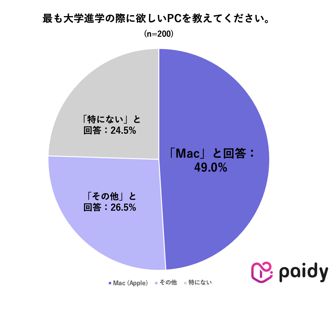 あと払いサービス「ペイディ」を提供するPaidyは、大学進学準備シーズンのタイミングで、2026年春に大学進学を予定する高校3年生・浪人生200人を対象に「26年新大学生のデバイス購入と新生活に関する意識調査」を実施。その結果、憧れのPC機種は「Mac」がトップになった⼀⽅、7割以上がAppleの「学⽣・教職員価格(学割)」を知らないことが判明しました。