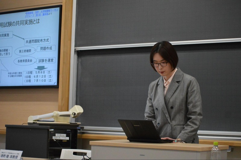 人間開発学部の前田助教は「共同実施で教員採用試験はどう変わる?」というテーマで講じた。