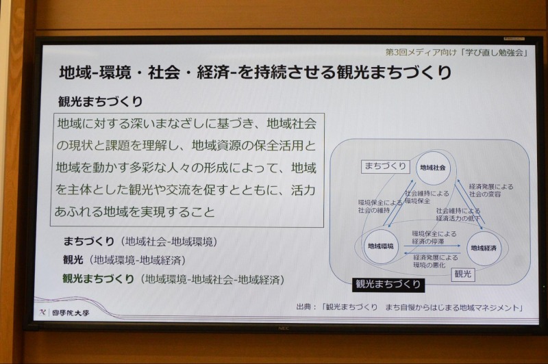 観光まちづくりとは、地域に対する深いまなざしに基づき、地域社会の現状と課題を理解し、地域資源の保全活用と地域を動かす多彩な人々の形成によって、地域を主体とした観光や交流を促すとともに活力あふれる地域を実現することだという。