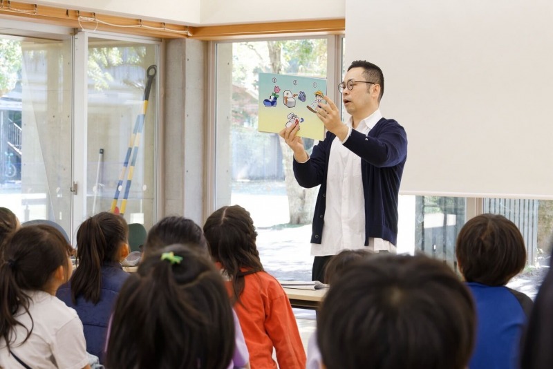 ここから、実際に授業を進めたのはアシックスの社員たち。まずはアシックス サーキュラーエコノミー推進部 奥津さんが、「シューズがゴミ箱に入る前の物語」の紙芝居を披露しました。紙芝居はクイズも交えたもので、ボロボロになったシューズくんが「サーキュラー・チェンジの魔法」によって特別な「資源のかけら」に変身し、ごみにならずに誰かの役に立ち続けるという循環の概念がストーリーとして描かれたもの。「勉強」という堅苦しさはなく楽しく学べるもので、子どもたちは興味津々な様子でした。