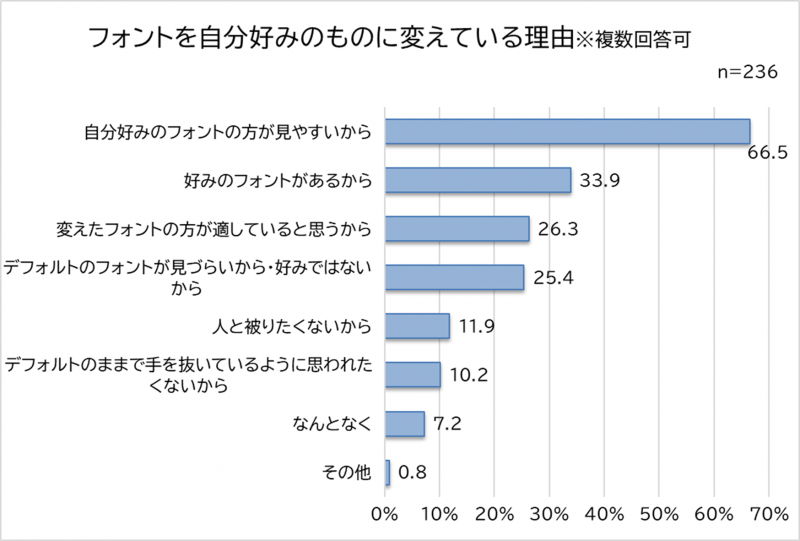 フォントを変える理由を聞いたところ、「自分好みのフォントの方が見やすいから(66.5%)」、「好みのフォントがあるから(33.9%)」、「変えたフォントの方が適していると思うから(26.3%)」が上位に。フォントの選択は見やすさといった実用性を最も重視しつつ、好みに応じた選択も行われていることがうかがえます。