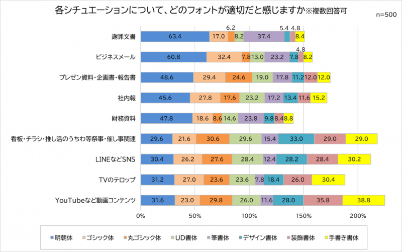 一方で、「看板・チラシ・推し活のうちわ等祭事・催し事関連」においては「デザイン書体(33.0%)」、「丸ゴシック体(30.6%)」、「YouTubeなど動画コンテンツ」においては「手書き書体(38.8%)」、「装飾書体(35.8%)」など、比較的ポップな印象のあるフォントが適切だと感じる人が多い傾向に。ただ、どのシチュエーションにおいても「明朝体」や「ゴシック体」に多くの票が集まり、この2つのフォントは、様々な用途で違和感なく使用できる印象を持たれていることが明らかとなりました。
