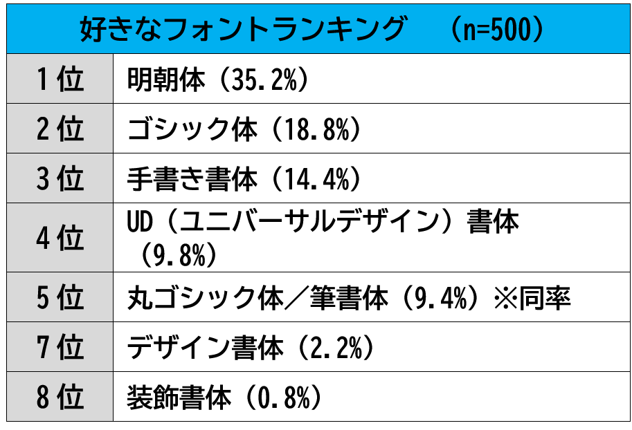 1位「明朝体」2位「ゴシック体」3位「手書き書体」