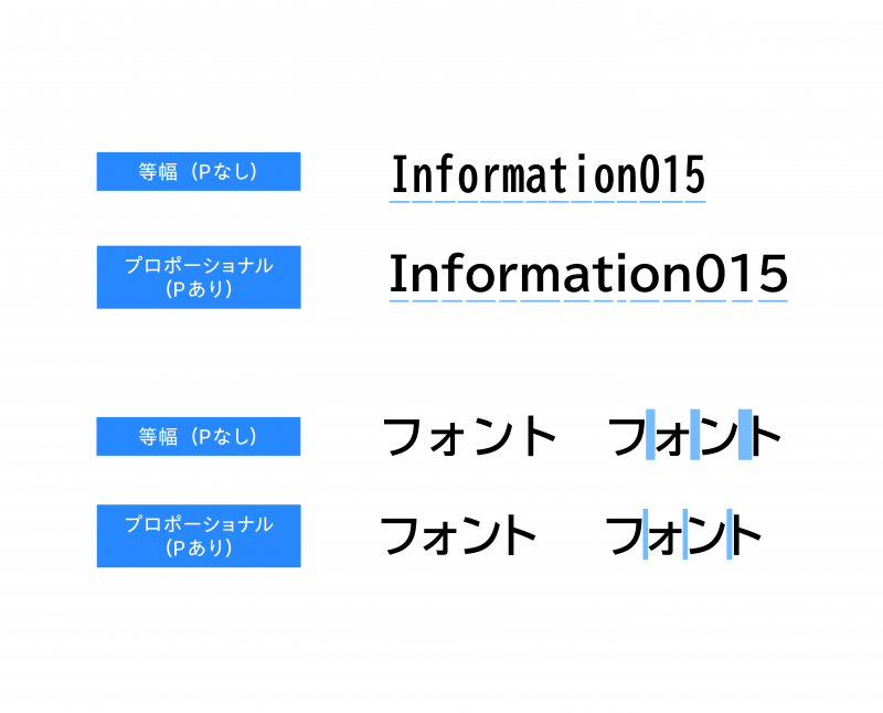 フォントに関する知識についても調査しました。フォントには、「MSゴシック/MS Pゴシック」や、「BIZ UDゴシック/BIZ UD Pゴシック」など、フォント名に「P」がついているものとそうでないものがあります。Pなしのフォントは等幅フォントで、かな・漢字は全角、英数は半角の等幅で表示されますが、P付のフォントは“プロポーショナルフォント”と言い、英数やかなの文字幅が文字の形によって異なります。