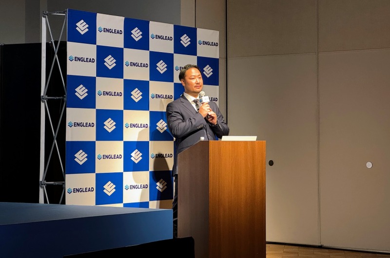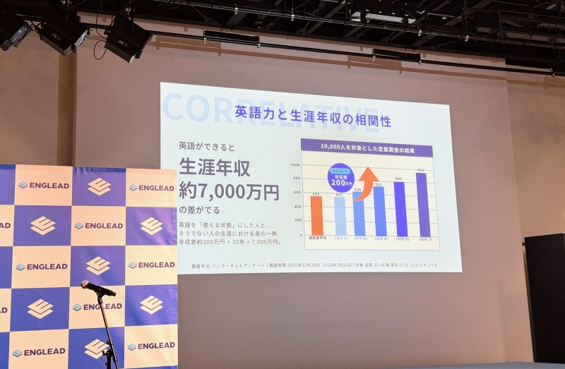 発表会ではまず、イングリードを展開する株式会社Morrow World 代表取締役社長 諸澤 良幸さんがプレゼンテーションを実施。英語力があると生涯年収に約7000万円の差が出るという調査結果を発表しました。