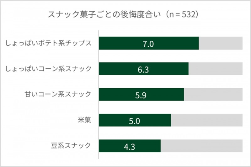 スナック菓子を食べた時の後悔度(10段階評価の平均)は、「しょっぱいポテト系チップス」が7.0と最も高く、次いで「しょっぱいコーン系スナック」(6.3)、「甘いコーン系スナック」(6.2)。