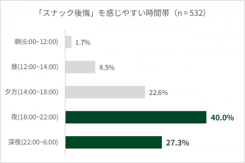 「最も後悔しやすい時間帯」は夜(18:00~22:00)が40%、深夜(22:00~6:00)が27%と夜間に集中しており、仕事終わり~就寝前のリラックスタイムほどスナック菓子を食べる誘惑に負けやすく、食べる時間帯と後悔が結びついていることが明らかになりました。