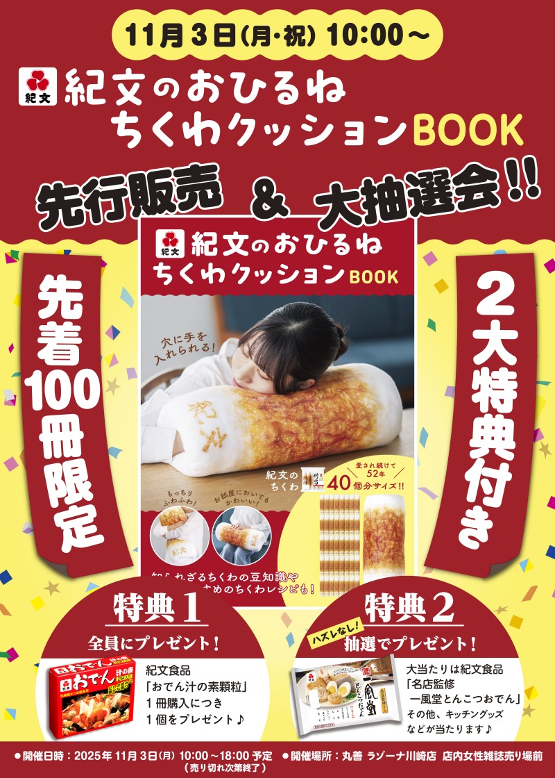 また、11月3日(月・祝)には、先着100冊限定の「先行販売&大抽選会」を実施。参加者全員に紀文食品「おでん汁の素顆粒」をプレゼント(1冊購入につき1個)。さらに抽選で「名店監修 一風堂とんこつおでん」などの商品が当たる2大特典つきとなっています。