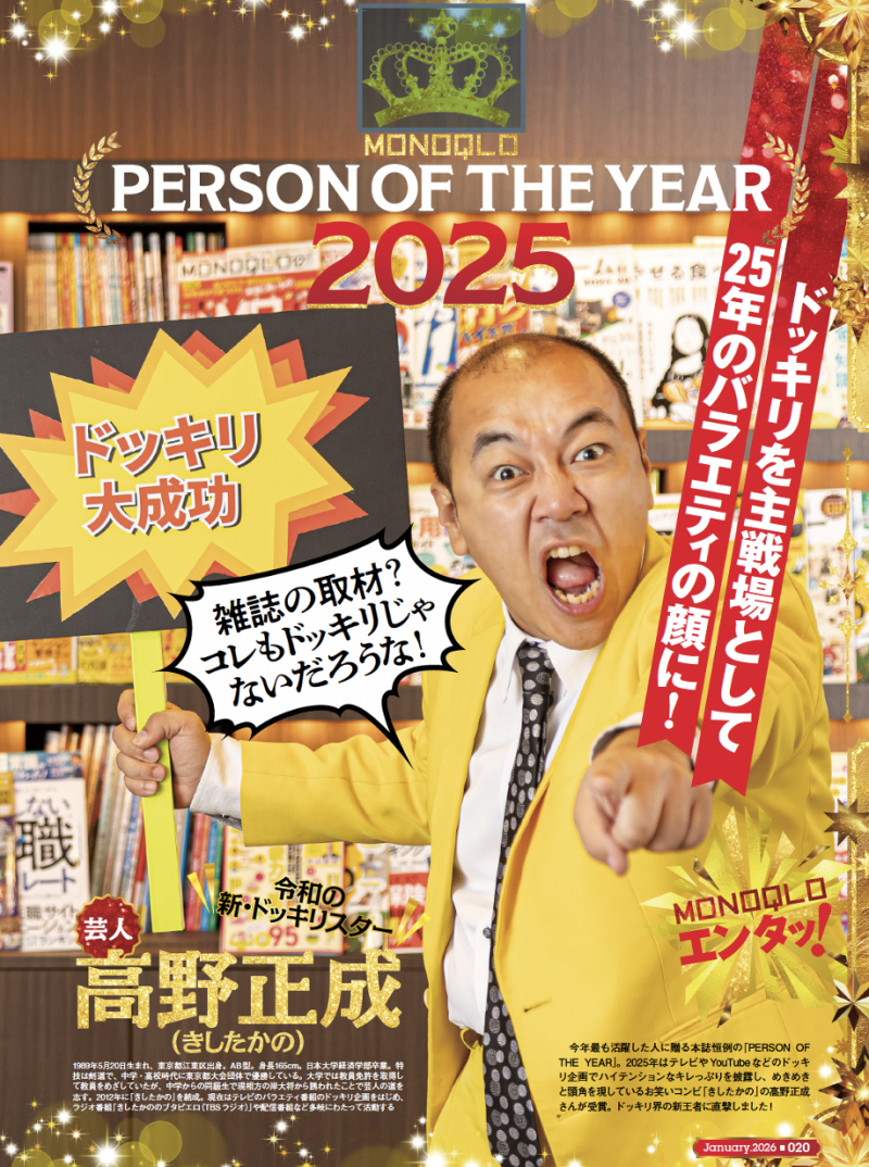 今年最も活躍した人に贈る恒例の「PERSON OFTHE YEAR」。2025年はテレビやYouTubeのドッキリ企画で頭角を現しているお笑いコンビ「きしたかの」の高野正成さんが受賞しました。