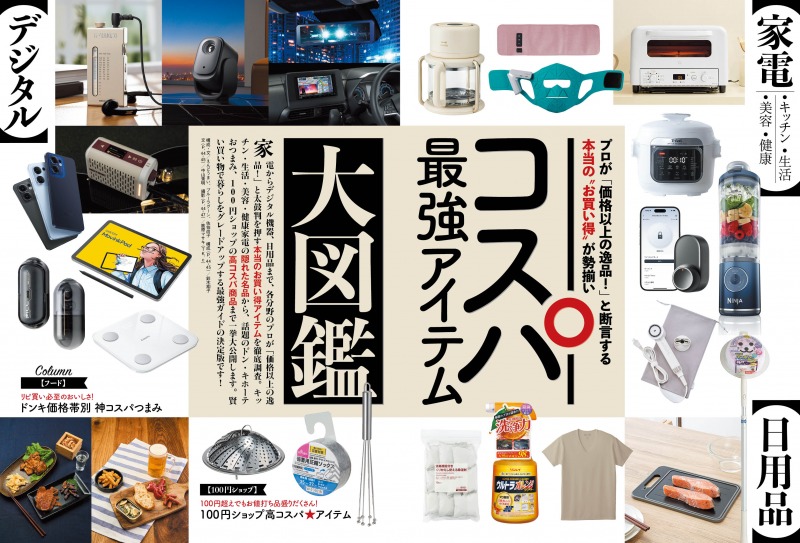 今号の特集は家電からデジタル機器、日用品まで、各分野のプロが「価格以上の逸品!」と太鼓判を押す本当のお買い得アイテムを徹底調査した「コスパ最強アイテム大図鑑」。キッチン・生活・美容・健康家電の隠れた名品から、話題のドン・キホーテおつまみ、100円ショップの高コスパ商品まで一挙大公開しています。