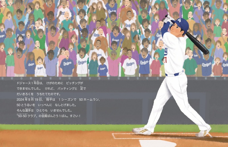 少年時代の父の教えから、花巻東高校、北海道日本ハムファイターズでの活躍、LAエンゼルスへの入団、けがからの復活。トレーニングや私生活のこと、LAドジャースで前人未到の50-50達成、デコピンの始球式、ワールドシリーズ優勝まで、大谷選手がこれまで歩んできた道のりが一冊の絵本となっています。
