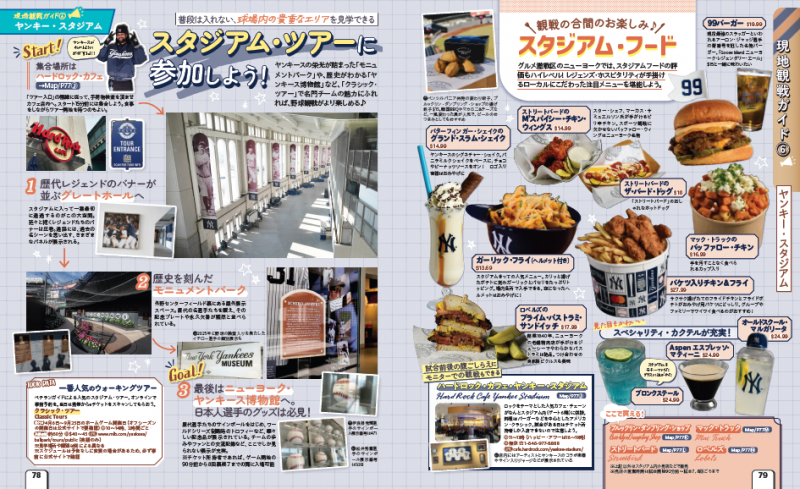そして、現地観戦ガイドでは、ユニクロフィールド・アット・ドジャー・スタジアムや、ヤンキー・スタジアム、リグレー・フィールドなど、日本人選手がプレーするチーム本拠地のうち、日本から行きやすい7スタジアムをピックアップ。スタジアムツアーやフード、グッズのほか、観戦のついでに訪れたい観光地ガイドも掲載しています。
