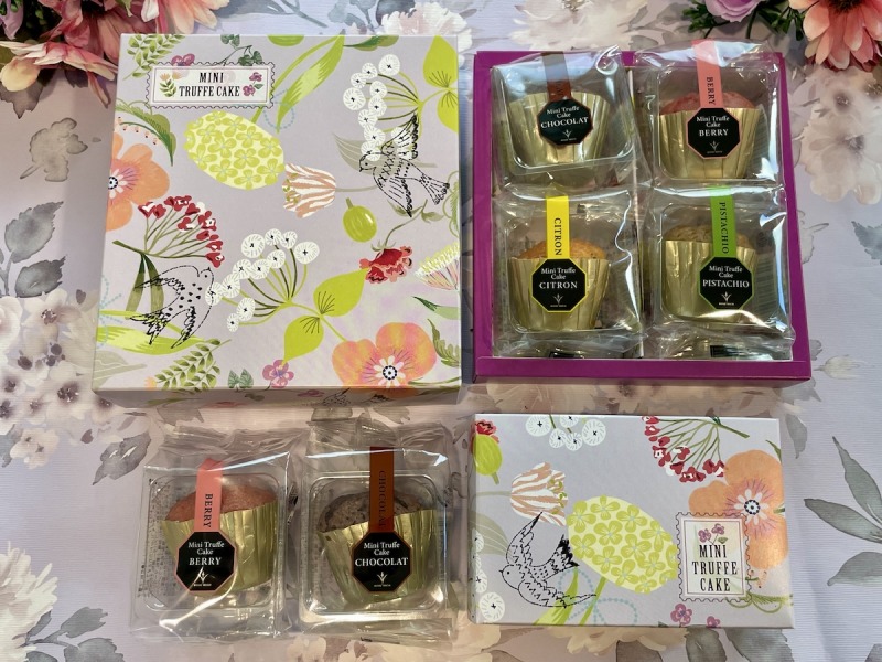 人気の「トリュフケーキ」のミニサイズは、定番のショコラに加え、ベリー、レモン、ピスタチオのフレーバーを用意。ミニサイズでも中にはしっかりトリュフ・オ・ショコラが入っています。2個入り・4個入のボックスと、3個入り・6個入りのポーチパッケージが用意されています。