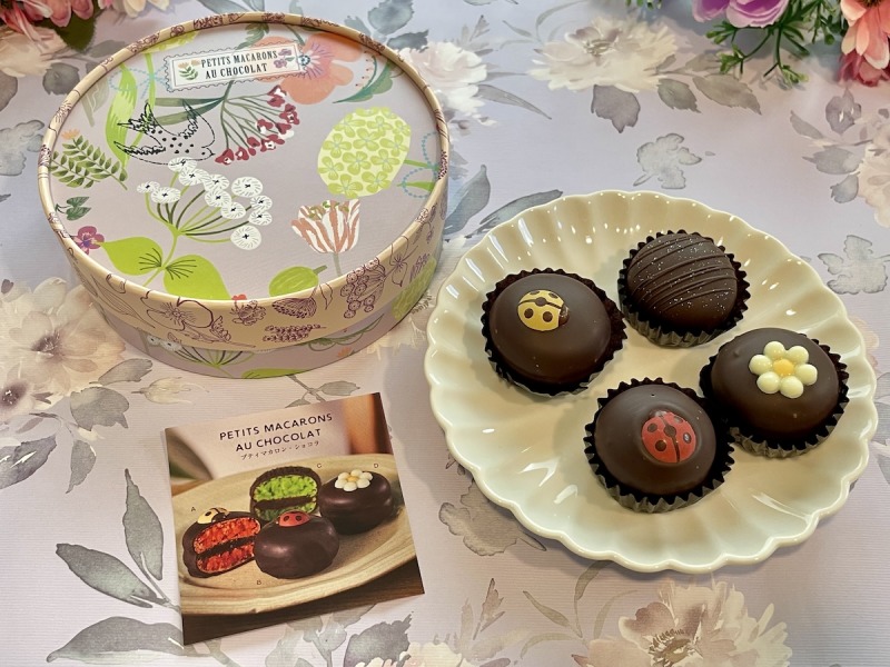 フルーツガナッシュのマカロンをチョコレートでコーティング。パッション、フランボワーズ、アプリコット、ライムの4種セットです。チョコレートのほろ苦さとマカロン生地の甘み、フルーツガナッシュの甘酸っぱさのバランスが絶妙です。てんとう虫やお花のモチーフがとってもキュート!