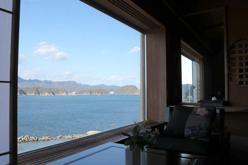 客室数は全部で41室。すべての部屋で海と熊野の山々が一望でき、抜群の開放感を誇る。広大な庭は、季節ごとに見え方が変化。寒い時期も手入れが入念に行われ、春、夏には緑に囲まれる。大きな窓枠はまるで絵画のキャンバスや額縁。その眺望は「変化する風景画」のよう。