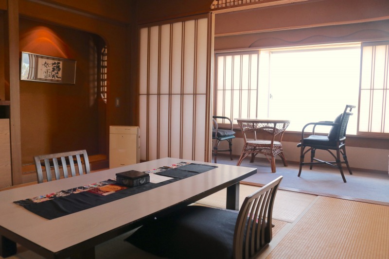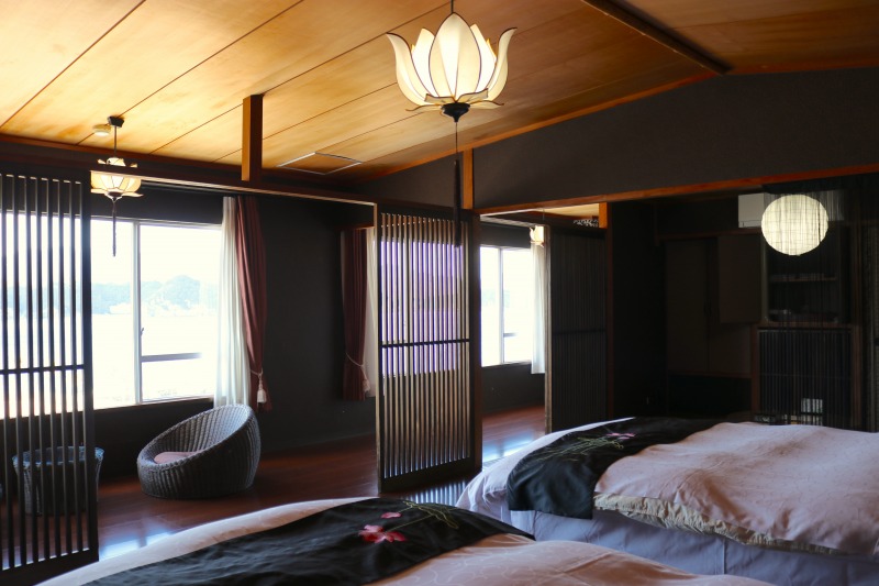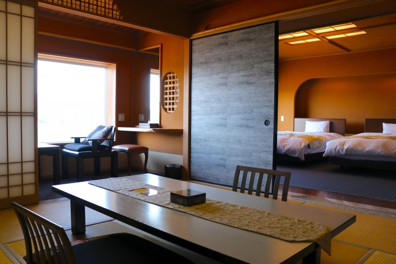 続いて客室内。最初に通されたのが和洋室スイートルーム「花蓮501」。ベッドルームを暖かく照らす花をイメージさせるランプや壁の模様・色はアジアンテイストで、海辺のリゾート気分が堪能できる。「花游亭 よひら」はシンプルながら高級感たっぷりの和室スタイル。木と土の風合いに包まれた数奇屋風の懐かしいデザインになっている。一方の「花游亭 やひら」はベッドルームと和室が別々になっており、ゆとりある時間が流れる。