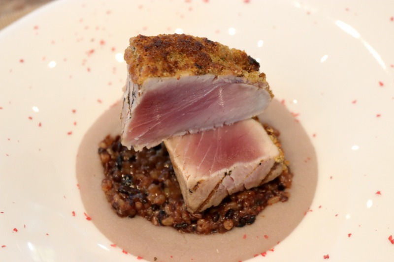 那智勝浦漁港で水揚げされたメバチ鮪のミキュイ 山椒と黒七味のクルート 古代米の焼リゾットと赤玉ねぎのヴルーテ