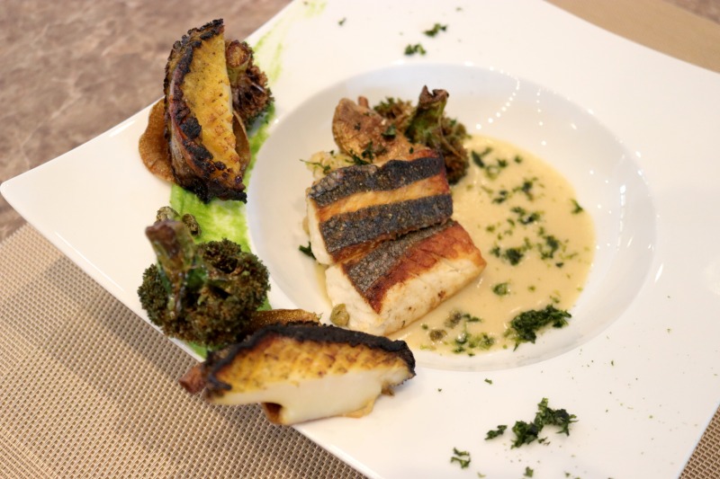 蝦夷鮑と那智勝浦漁港で水揚げされた白身魚のポワレ 海老芋とポワローのエクラゼ 磯の香りのソースヴァンブラン
