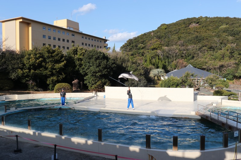 また、宿にいるとどこからか、くじらやイルカの鳴き声が聞こえてくる。それもそのはずで、人気観光スポットの「太地町立くじらの博物館」が隣接。同施設では、「くじらの町」として知られる太地町のくじらに関する歴史を知ることができるほか、くじらとイルカのショーも実施されている。くじら、イルカたちが見せるハイジャンプは興奮すること間違いなし。この日はイルカショーが開催されていたが、機敏な泳ぎに客席から歓声があがり、また尾びれをパタパタさせて来場者にお礼をするかわいい姿に表情が緩んだ。