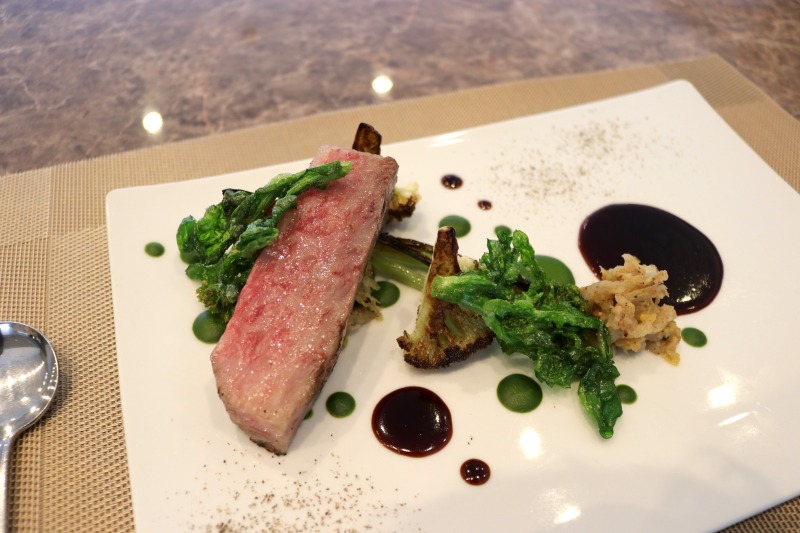 三重県産 熊野牛サーロインのロティ 白菜エチュベとポレンタのフリット 菜の花ピュレとソースヴァンルージュ