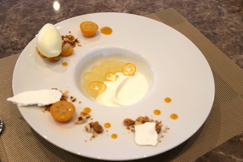 酒粕ブラマンジェ 金柑コンポートとそのジュレ 胡桃とヘーゼルナッツのクランブルとソルベ