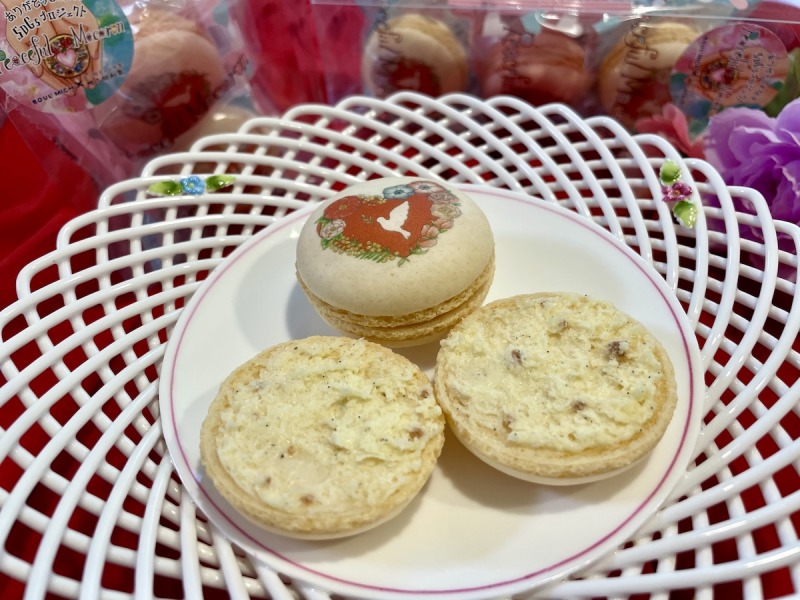 鴨志田さんの世界観溢れる、可愛いとっておきのいちごスイーツがラインナップ。『ピースフルマカロン』の苺ショートケーキ味も販売しています。スイーツとアートの融合を体験できる絶好の機会となっています。
