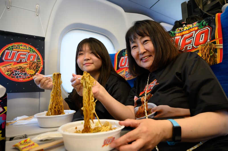本企画は、人気YouTuber・そろ谷さんのチャンネル「そろ谷のアニメっち」とコラボしたテレビCM(2024年)に登場した「ソースエクスプレス」を実際の新幹線で再現したもの。車内では、販売員と乗客のユニークなやりとりを交えながら、香り高いソースが特長の「U.F.O.」を楽しむ“非日常体験”が提供されました。CM放映直後から上がった「ソースエクスプレス、乗ってみたい!」「どの新幹線で食べられるの?」との声をきっかけに実現した今回のイベントは、多くの参加者にインパクトのある体験を届けました。