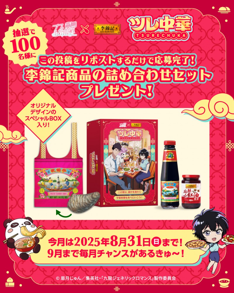 また、李錦記公式Xアカウント(@leekumkeejp)の対象の投稿をリポストすると、抽選で毎月100名(合計300名)に李錦記商品詰め合わせスペシャルBOXをプレゼント。BOXはTVアニメ版『九龍ジェネリックロマンス』コラボオリジナルデザインとなっています。