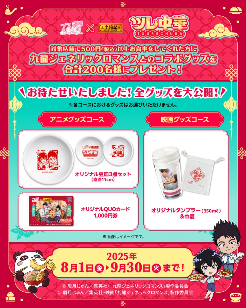 さらにコラボキャンペーンとして、全国約1500店の対象店舗で、500円(税込)以上の食事をすると『九龍ジェネリックロマンス』とのコラボグッズを合計200名にプレゼント。開催期間は8月1日(金)14時~9月30日(火)まで。