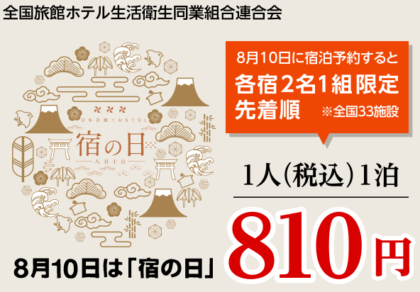 「宿の日week」の一環として行われる「810円キャンペーン」では、全国旅館ホテル生活衛生同業組合連合会に加盟している施設の中から全国33の施設を対象に、一人 810円(税込)で予約できるプランを限定販売します。対象施設は下記より。