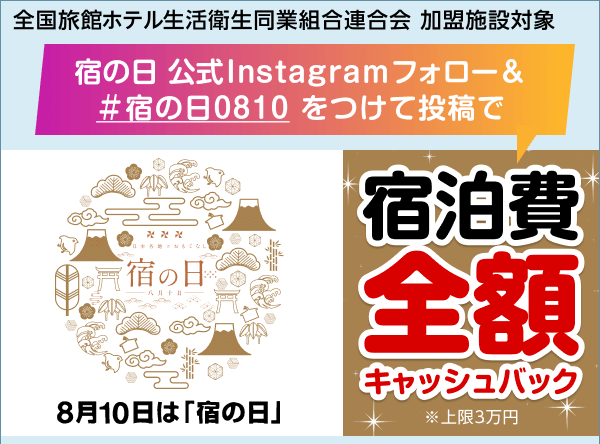 対象期間中に宿泊し、「宿の日」公式 Instagram をフォロー。「#宿の日 0810」を付けて旅の様子を投稿した方の中から抽選で 50 名の方に宿泊費をキャッシュバックするという内容となっています。