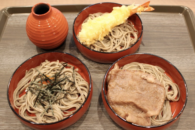 三色割り子そば 2,400円(税抜)は、出雲地方独自の蕎麦の食べ方で味わうことができ、浅草にちなんで、黒毛和牛と海老天がのっている。名人そば 1,800円(税抜)は、出雲地方特産の一味唐辛子が入った赤てんを使用。「冷たい蕎麦と温かい蕎麦では、それぞれに独自開発の出汁を使用しています」と松田氏は述べた。天ぷらは、黒毛和牛やかき揚げ、大海老、焼き芋、ズッキーニなどが楽しめる。