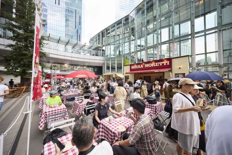 会場は渋谷ストリーム前の稲荷橋広場。来場者は20歳以上なら誰でも、最初の一杯のビッラモレッティを無料で楽しめます。開放感のあるテラスで飲む冷えたビールは、まさに夏にぴったり。イタリア料理とのペアリングも用意され、贅沢なひとときを過ごすことができました。