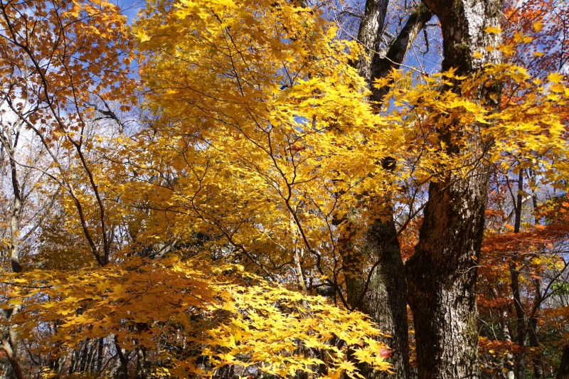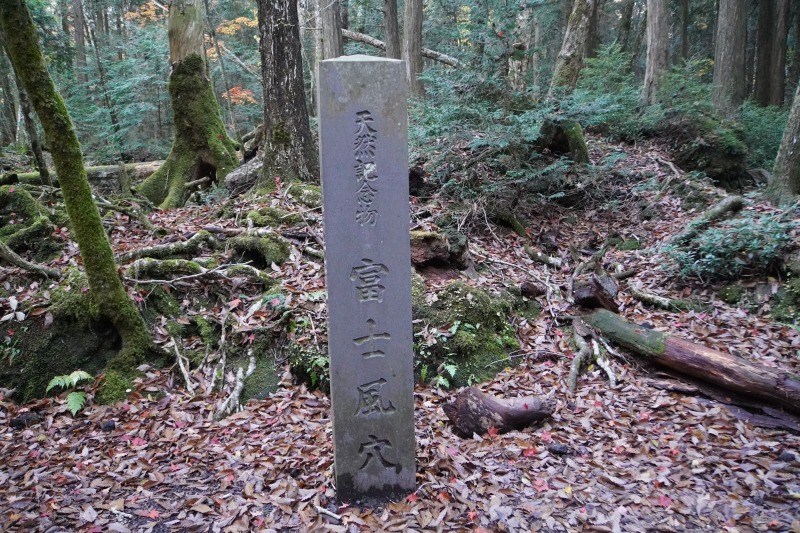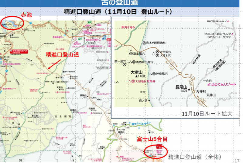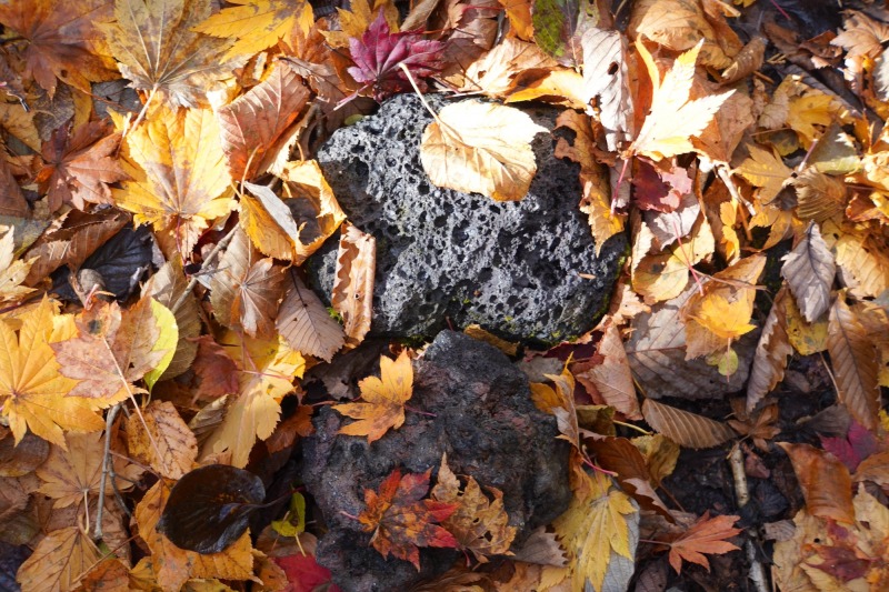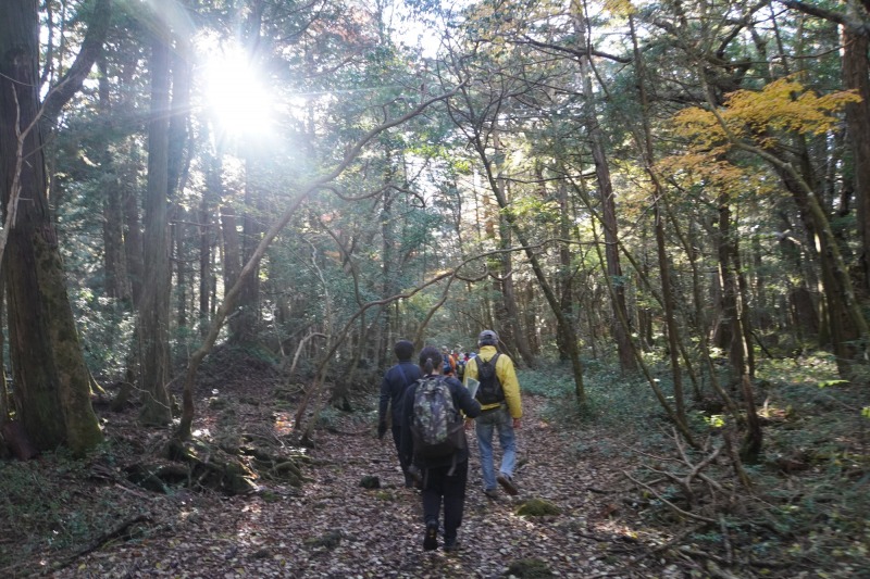 それでも紅葉の季節と重なり、美しい自然美をたくさんみることができた。この登山道は大正時代に整備された比較的新しい登山道。精進湖南岸の赤池を起点に、青木ヶ原を抜け、大室山、長尾山などの側火山の間を縫うように登り、小御嶽に至る距離17km以上、1400m近い標高差を登る長いルートだ。その中に青木ヶ原樹海や富士風穴、大室山など雄大な自然が残されている。
