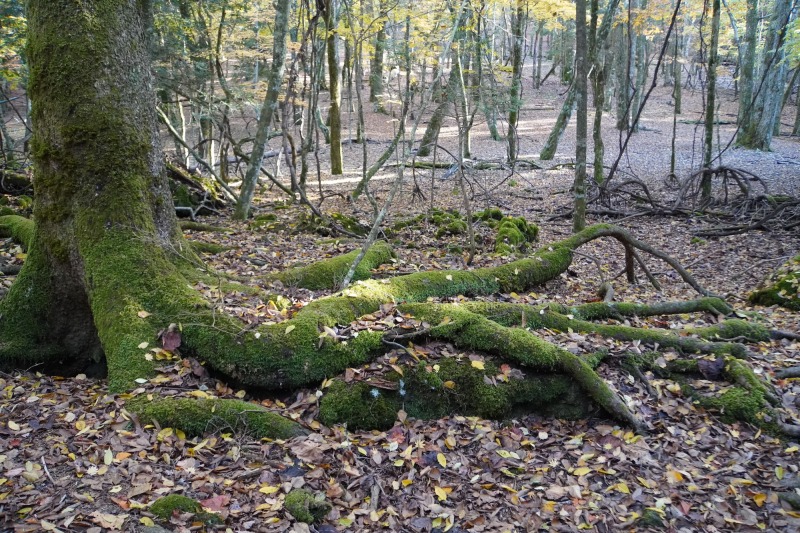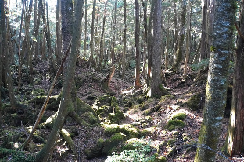 登山道入口付近ではスコリアが降ったことから土が形成されているため植物もしっかり育った様子が見られる。しかし、進むほどに溶岩の上に何も降らなかったため、土が形成されない地形となる。そのため、木々が根をはれずに地表をはっていくような樹海らしい景観に変わっていく。