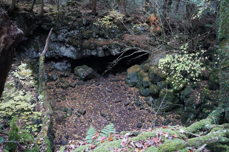 富士河口湖町の精進地区の青木ヶ原内に所在し、青木ヶ原丸尾(溶岩流)内の溶岩洞穴。標高1,110m、長さ230m以上、洞底幅5~10mの大きさだ。天井も高く平均5mで、ほとんど直立のまま出入りできる規模の大きい溶岩洞穴である。火山の噴火で流れ出た溶岩の表面が空気に触れて冷え固まってカサブタのようになり、内部の溶岩が流れてできるコウモリ穴のような洞窟を溶岩洞窟と言う。